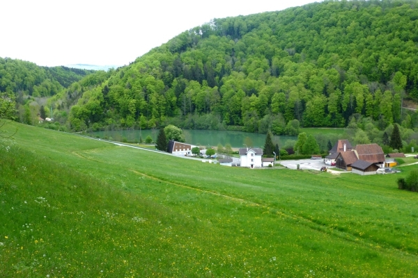 A cet endroit, faire un crochet pour s'engager sur le chemin vicinal qui passe au-dessus de l'étang de la Réselle, géré et entretenu par la Société des Pêcheurs de Delémont et environs. Soyhières, notre lieu d'arrivée, se trouve à quelque 2 km.